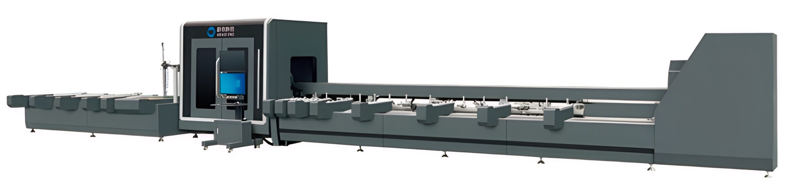 Компоновка оборудования рассчитана на работу с длинномерными заготовками: станок включает закрытый центральный рабочий модуль и длинные подающие/приемные секции, что делает его удобным решением для современного автоматизированного производства.