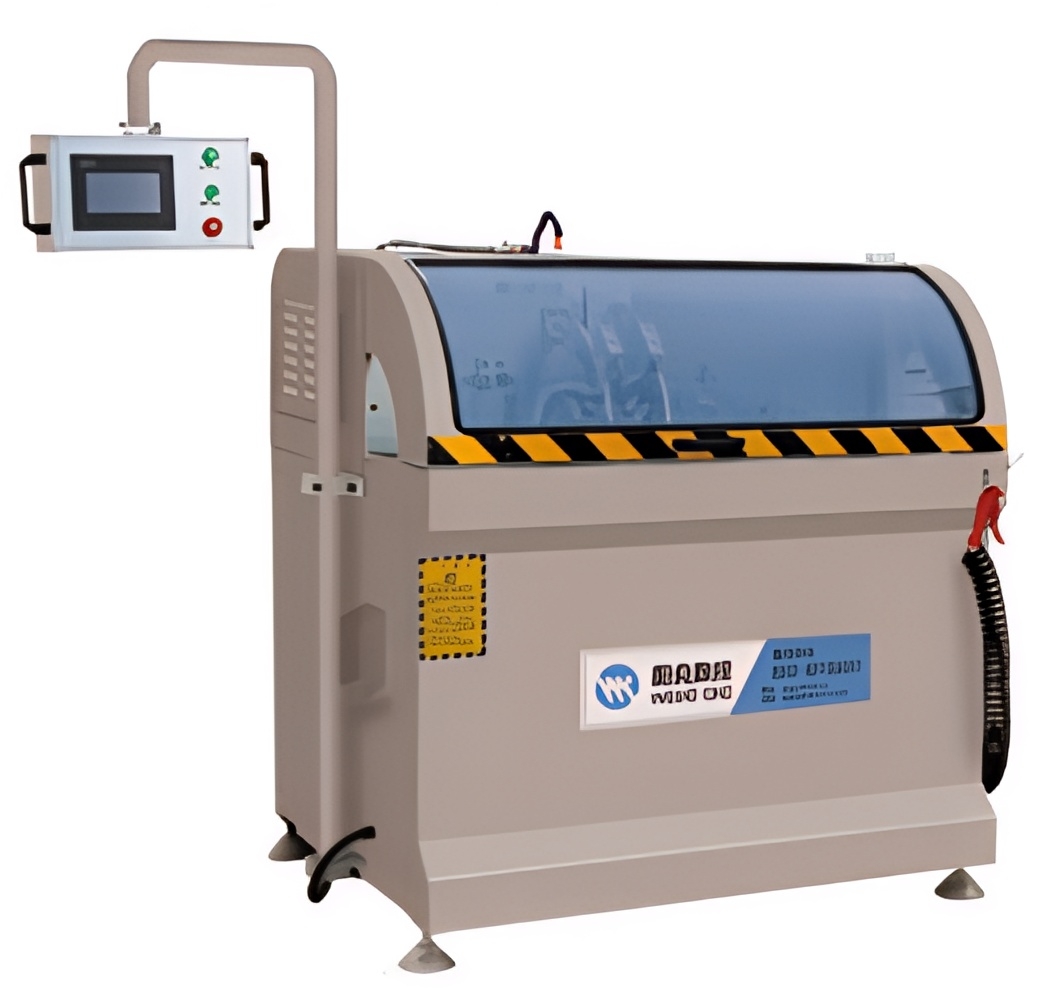Компактная конструкция с защитным кожухом, системой ЧПУ и отдельной панелью управления делает станок практичным решением для безопасной и эффективной резки алюминиевых профилей в серийном производстве.