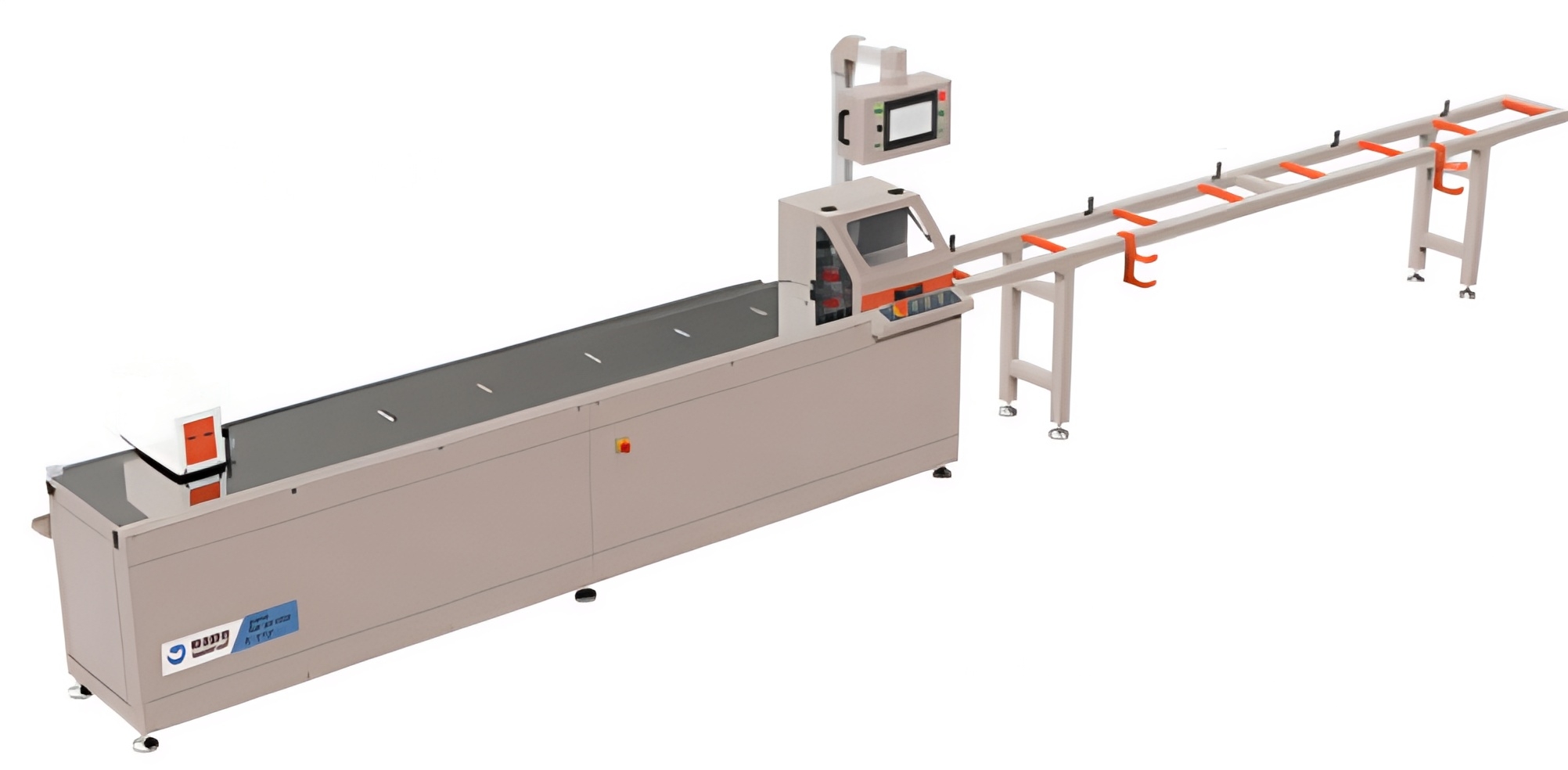 Конструкция оборудования включает основной режущий модуль, подающий стол и длинную опорную секцию для подачи заготовок, что делает станок практичным решением для серийной резки штапика и аналогичных профильных элементов.