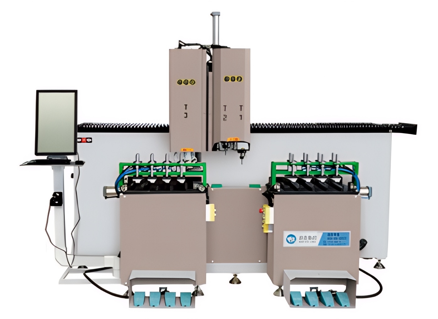 Конструкция станка включает основную станину, две вертикальные рабочие головки, систему фиксации профиля и отдельную панель управления, что делает оборудование практичным решением для серийной обработки узких алюминиевых профилей.
