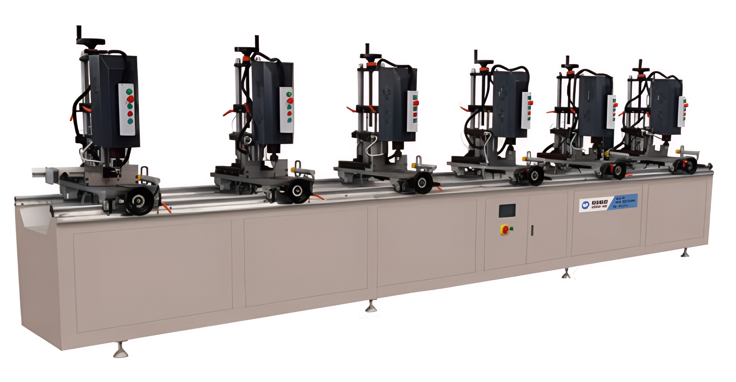 Длинная станина, несколько сверлильных головок и промышленная компоновка делают оборудование практичным решением для участков по обработке алюминиевых профилей в серийном режиме.